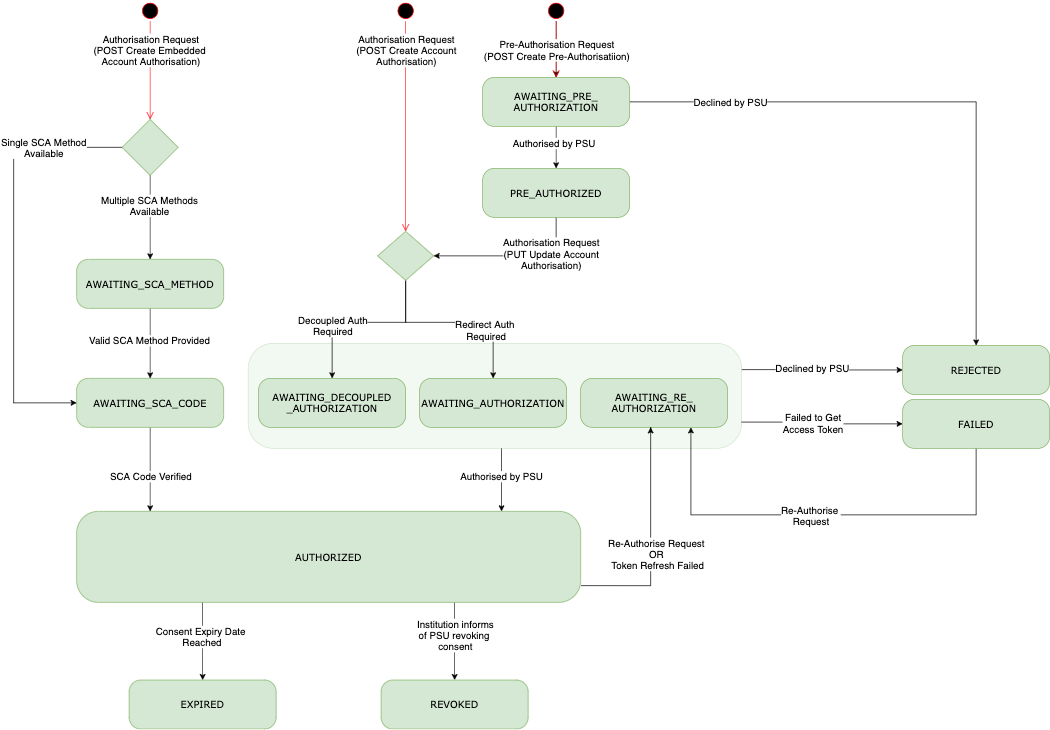 If re-authorisation is successful, thestatus of the Consent will be AWAITING_RE_AUTHORIZATION. The consent-id and the consent-token don’t change.